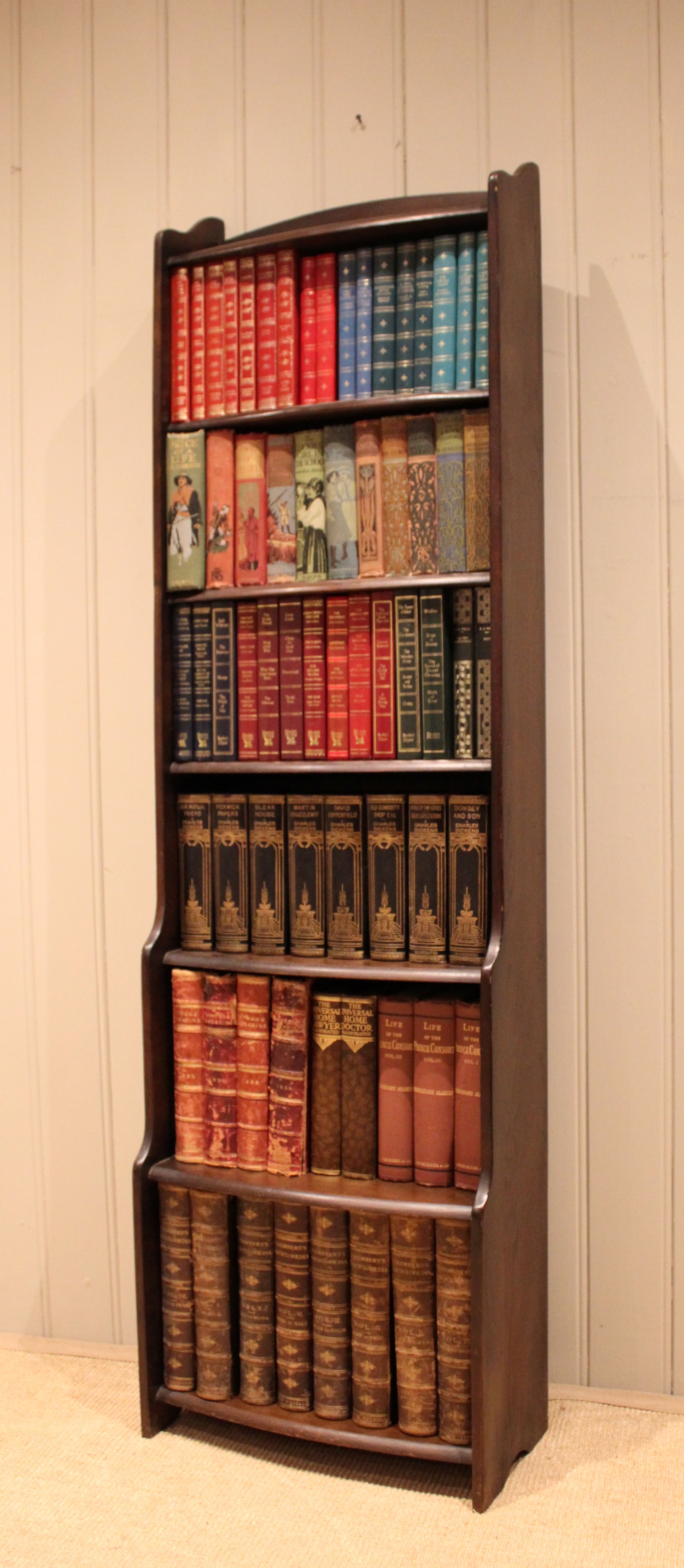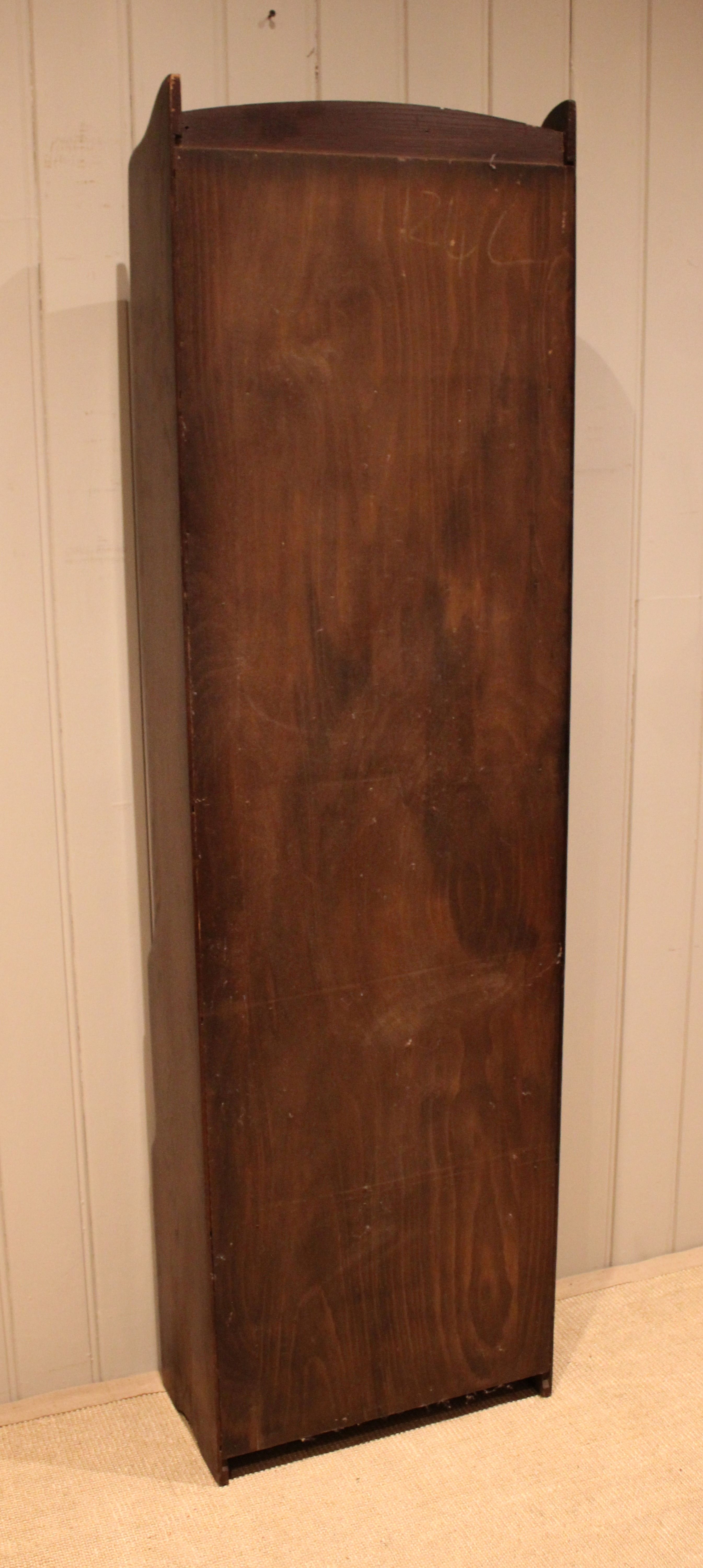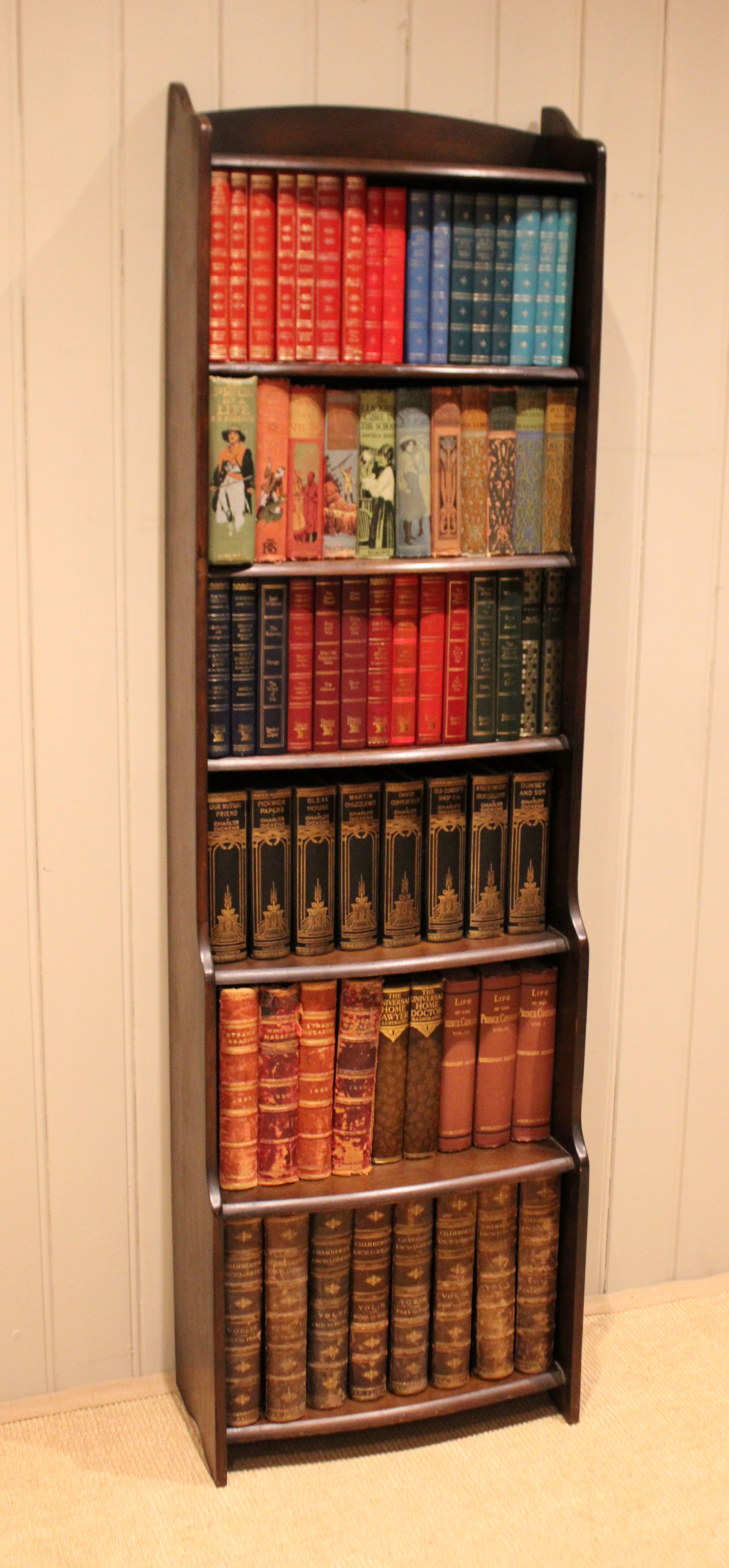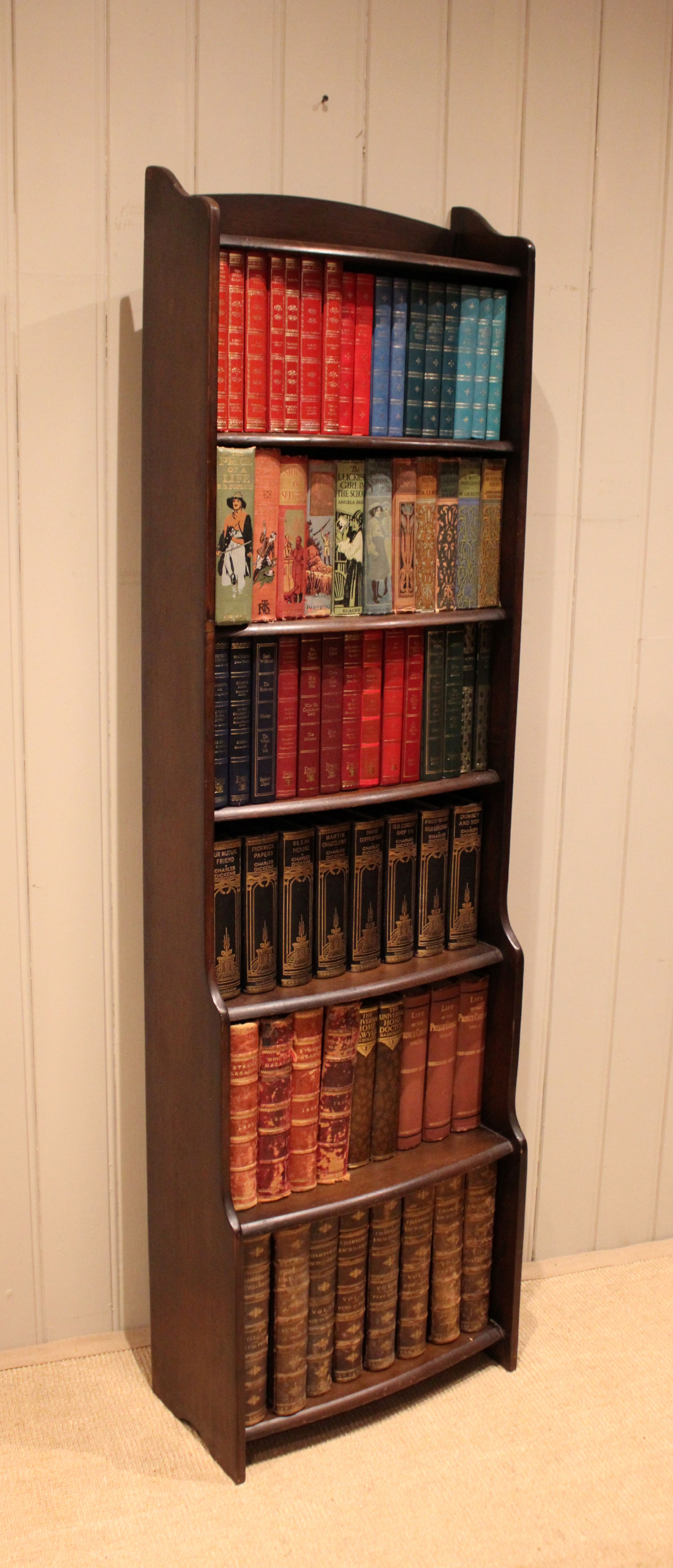 Tall slim oak open bookcase having six fixed graduated bow front graduated shelves with a shaped top , raised on side brackets. The shelf dimensions are 44 cm wide from the bottom up 27.5 cm high x 22 cm deep, 25 cm x 22 cm deep , 23 cm high x 18 cm deep , 20 cm high x 15 cm deep, 20 cm high x cm deep , and at the top 20 cm high x 15 cm deep .
