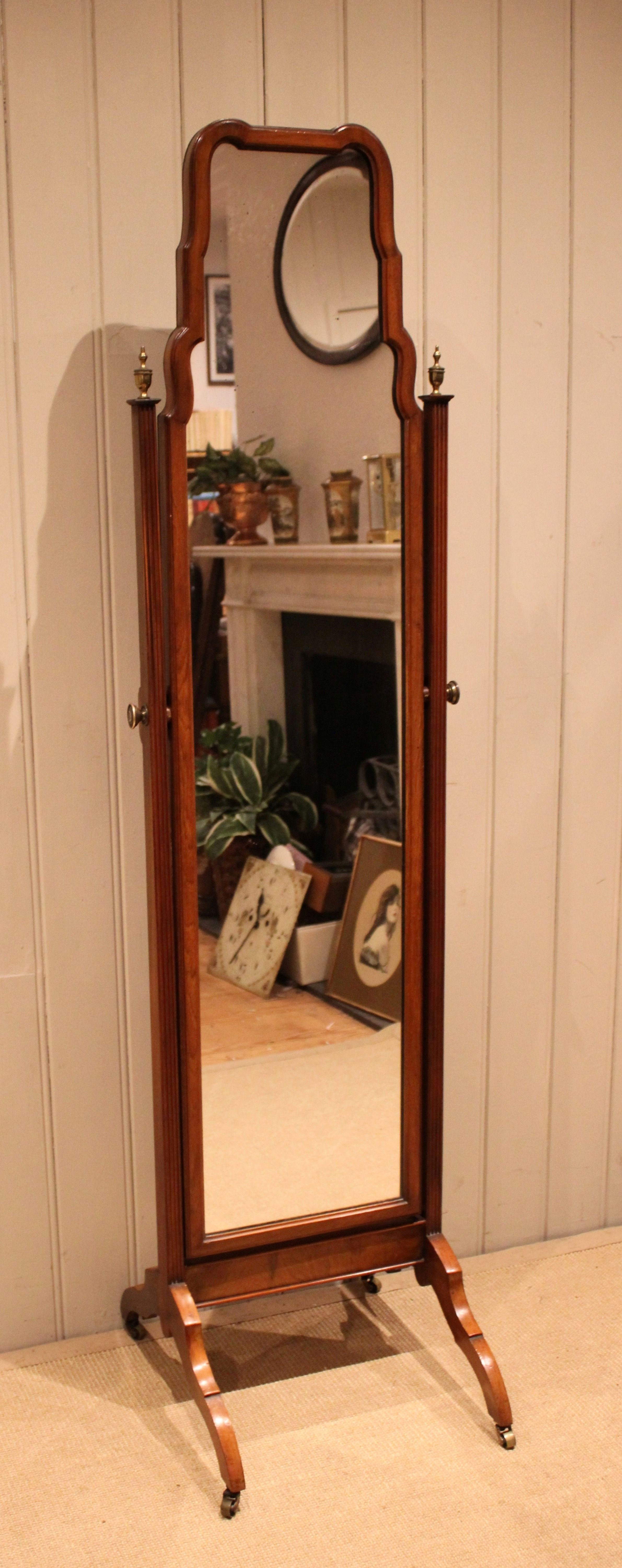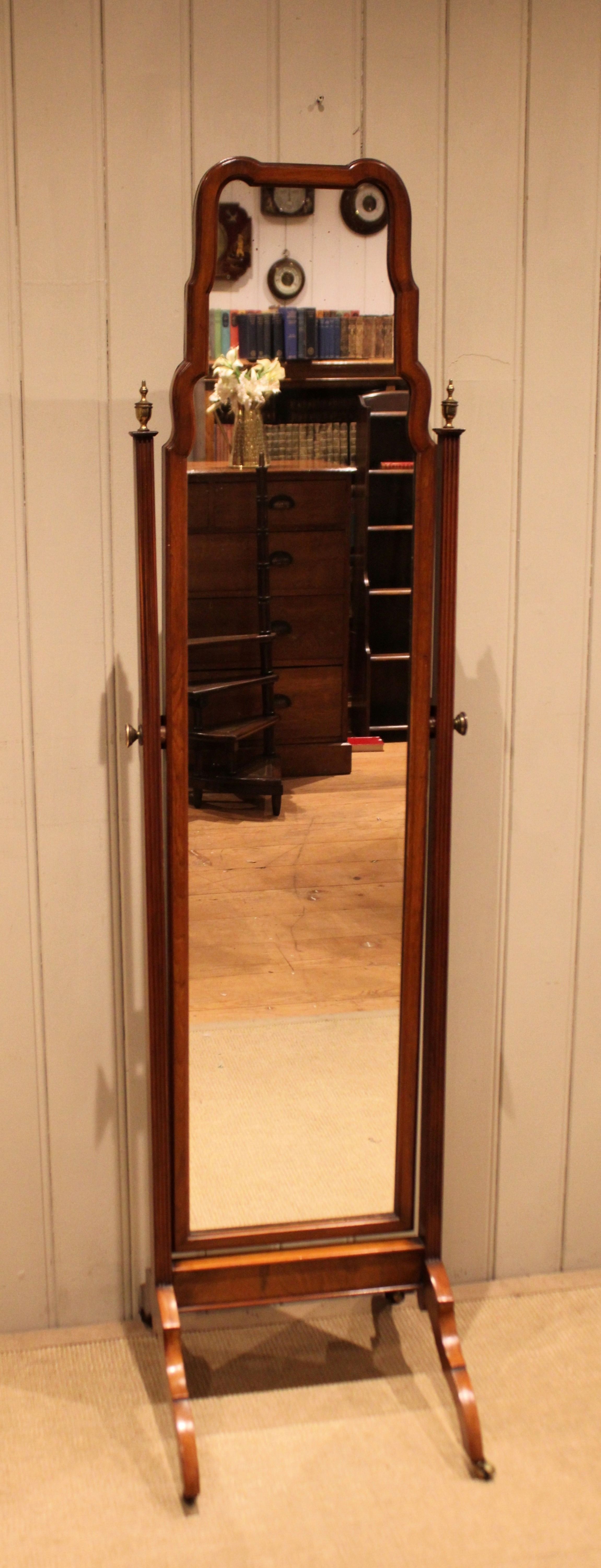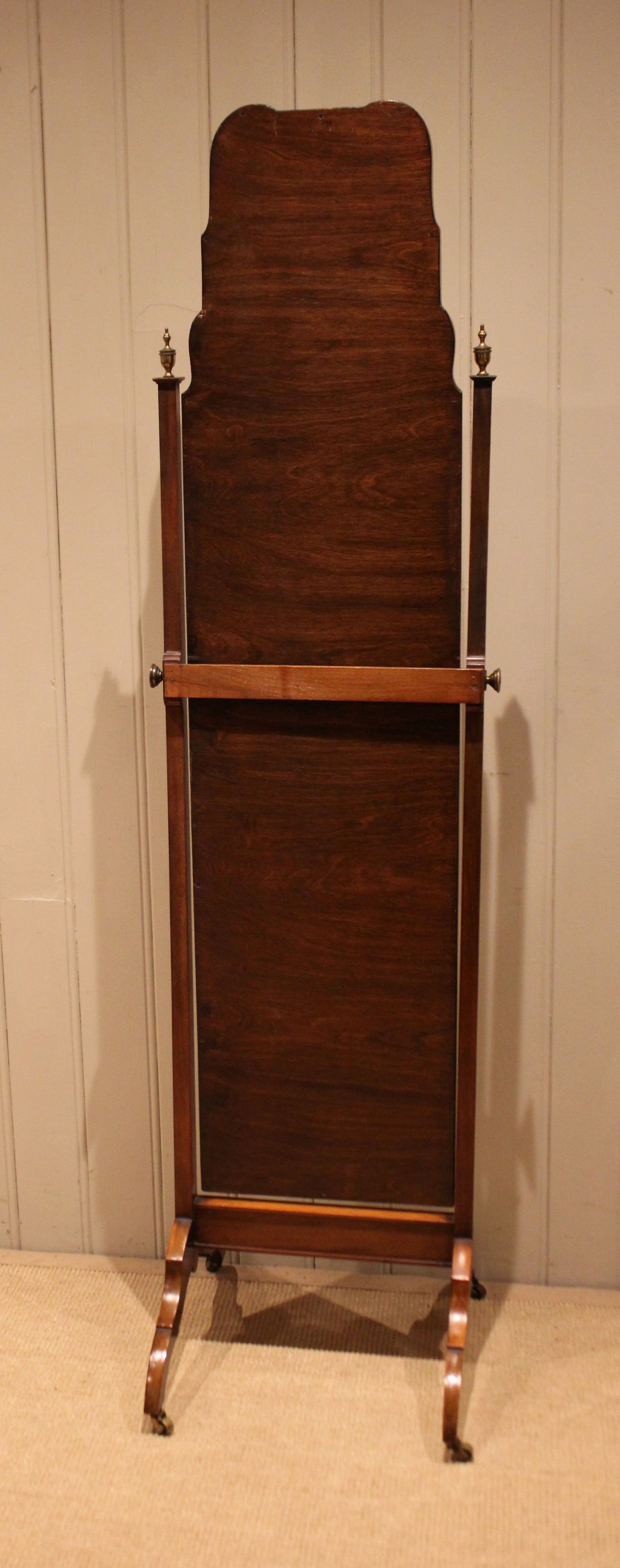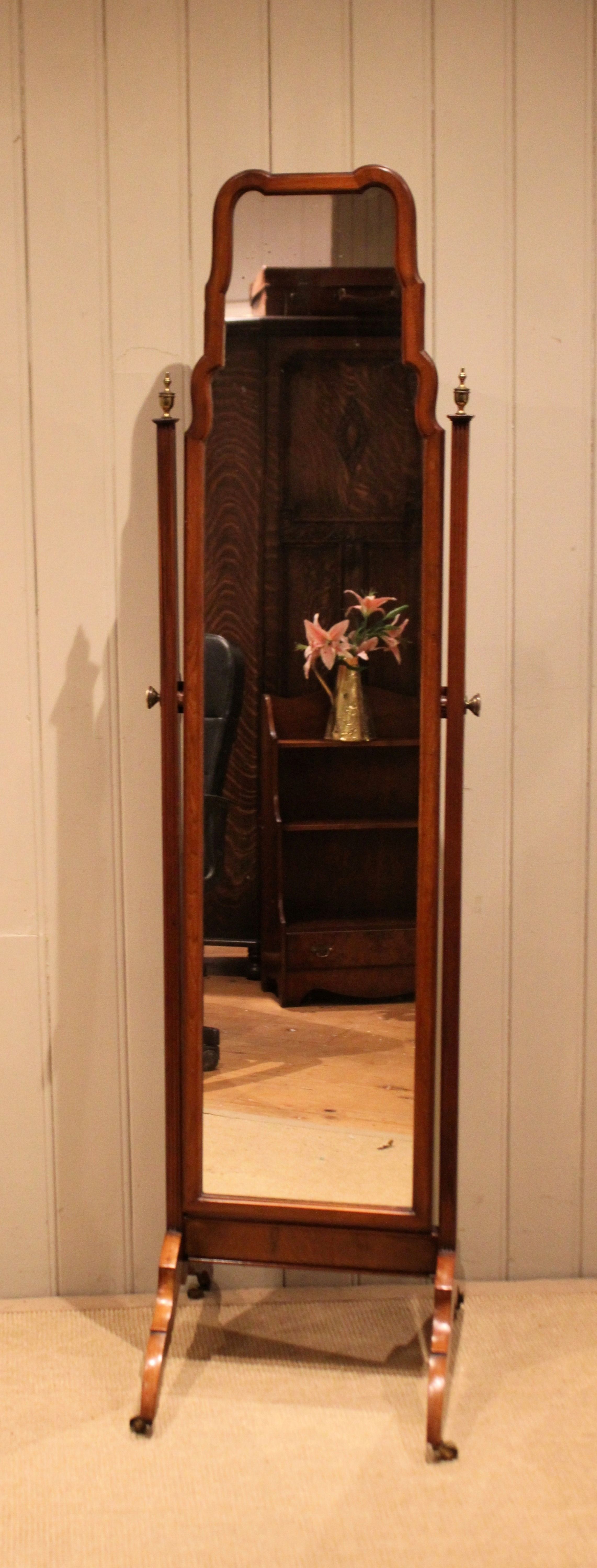 Walnut cheval mirror having an shaped top , Brass side finials and handles , held in a walnut frame ,raised on outplayed legs , with the original castors .