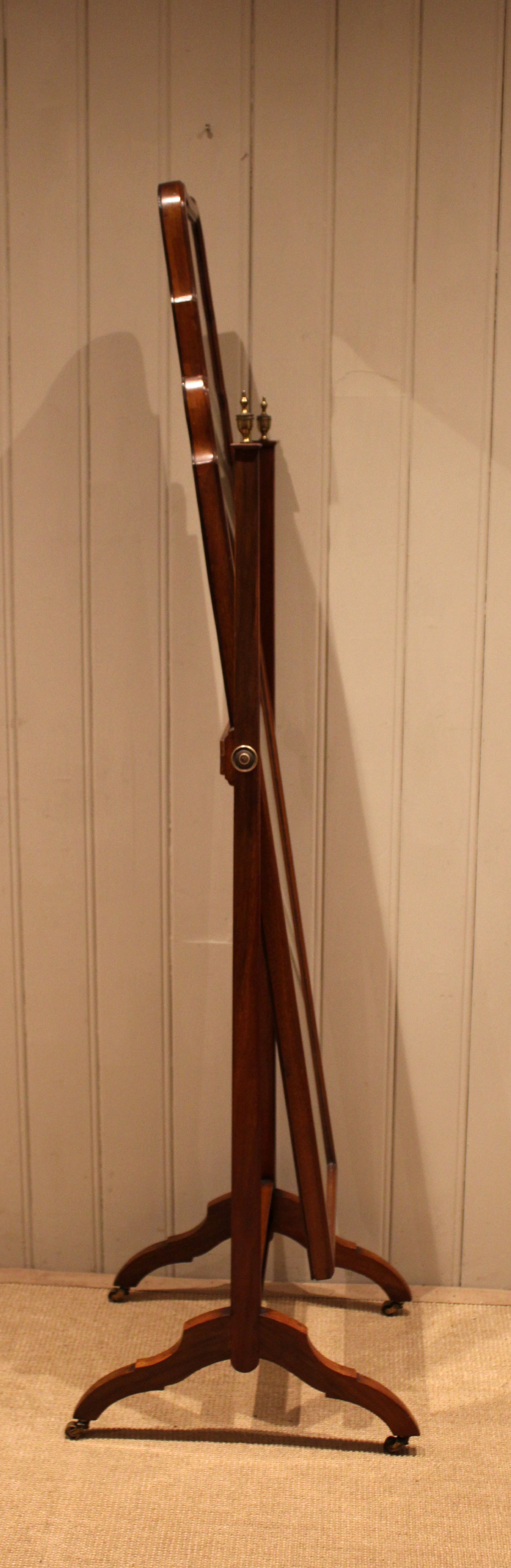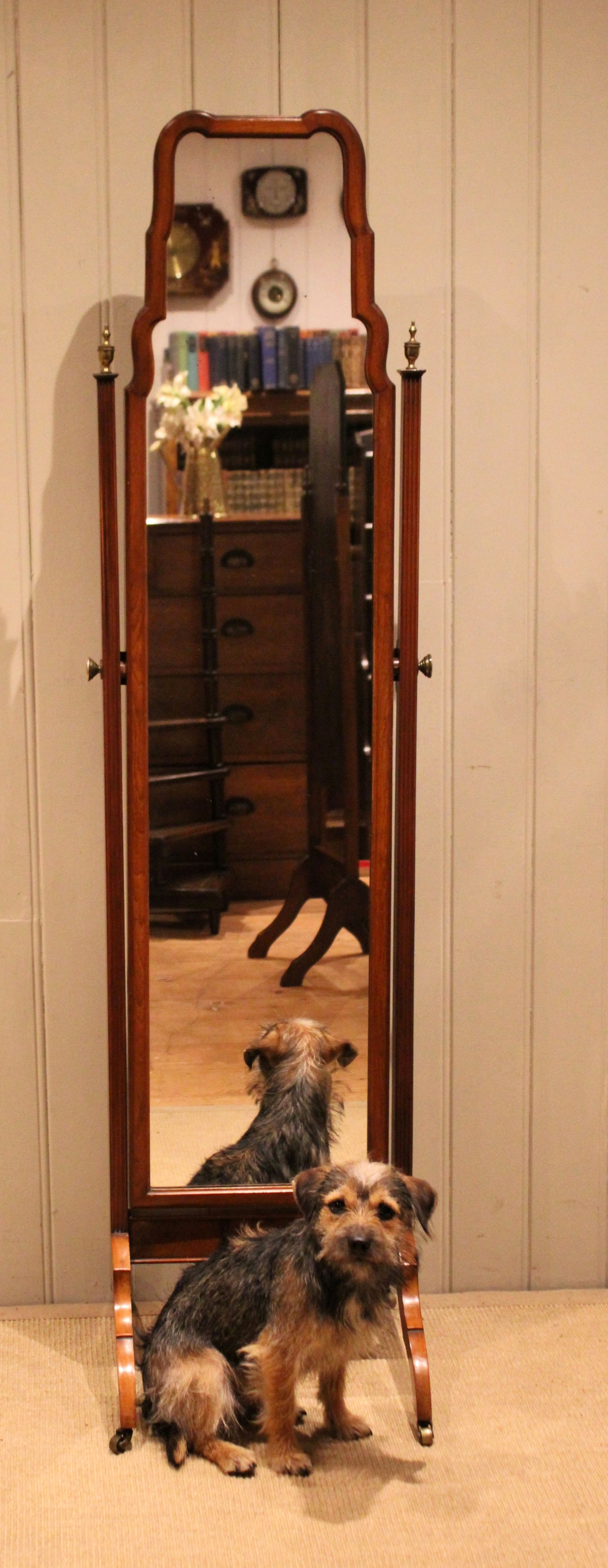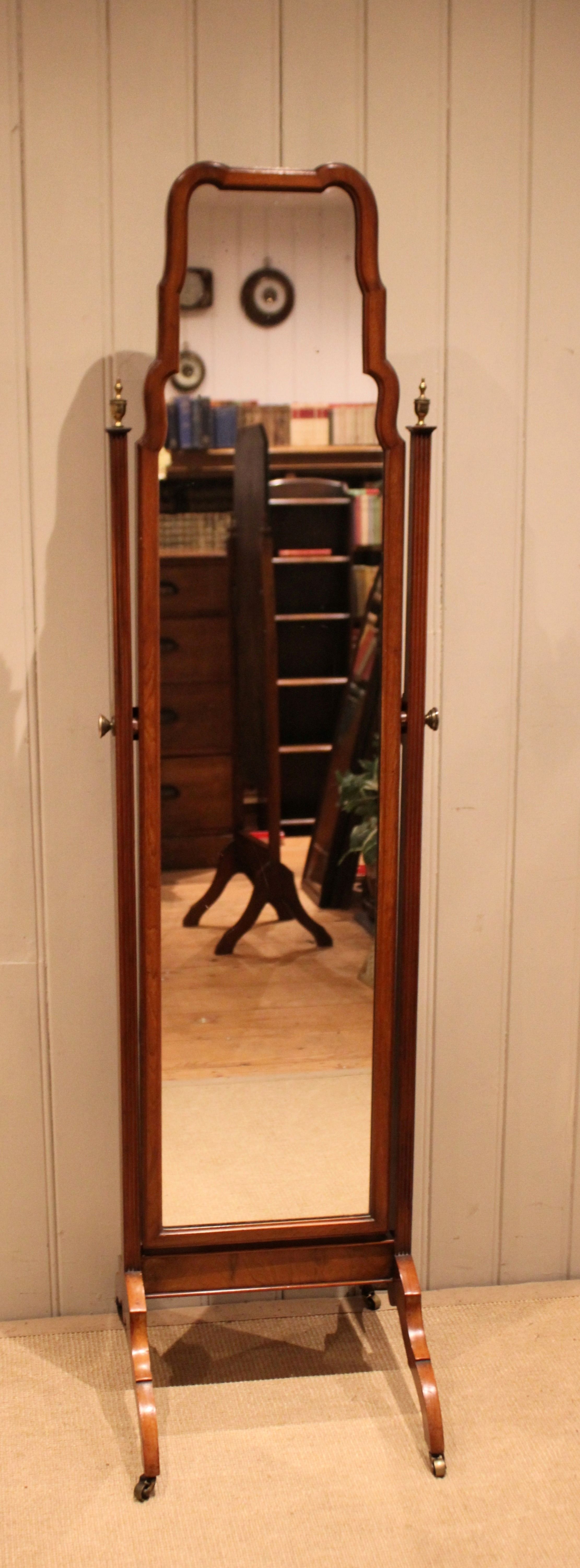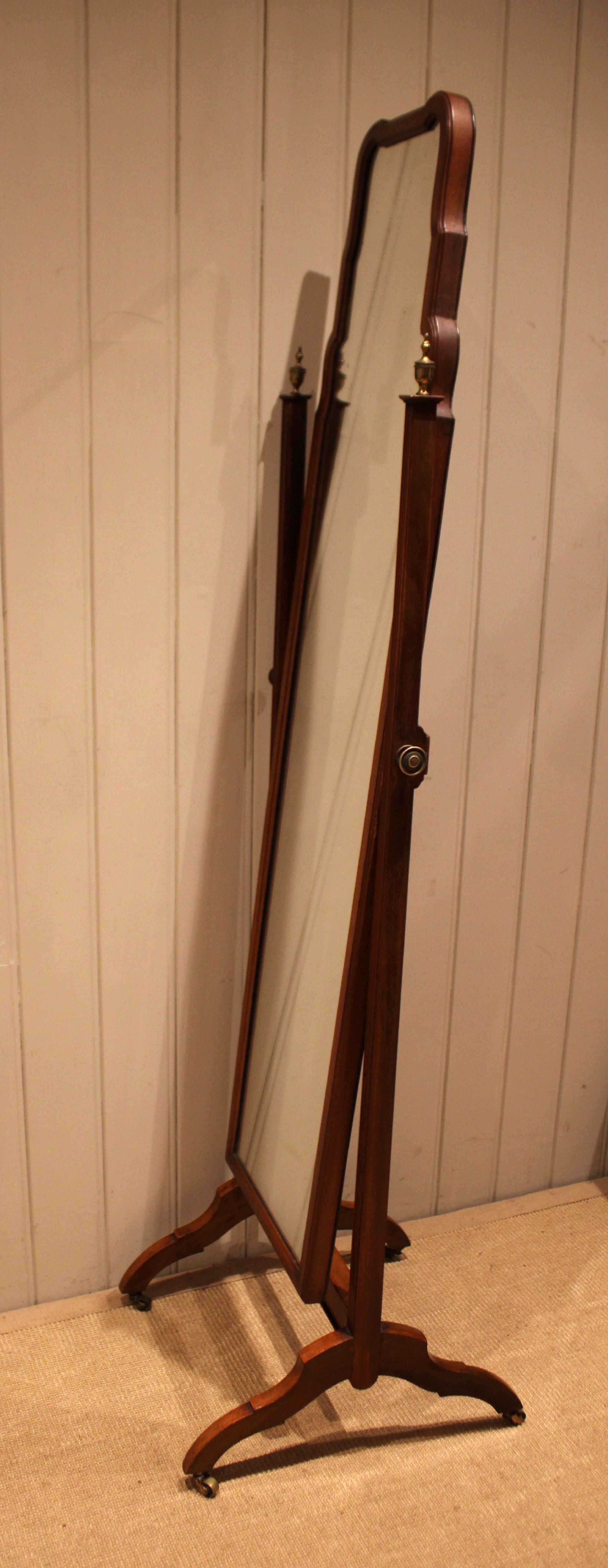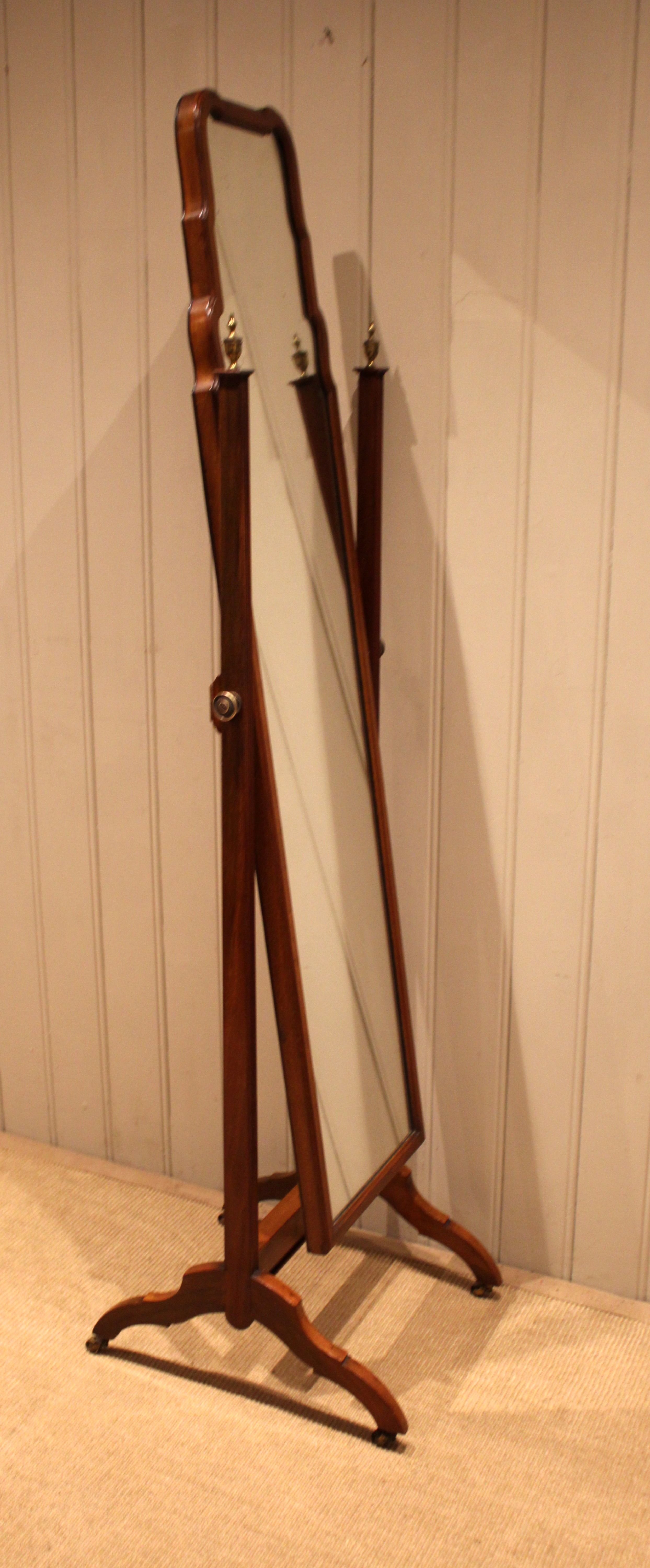 Walnut cheval mirror having an shaped top , Brass side finials and handles , held in a walnut frame ,raised on outplayed legs , with the original castors .